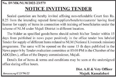 Tender for /suppliers/hotels/restaurants/ having food license for supply of items in connection with training of beneficiaries under the scheme of NLM under Majuli District in different location.
