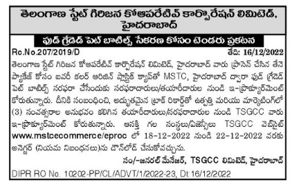 Tender for Suppliers/Manufacturers for Supply of Food Grade PET Bottles with Ivory Color Origin Plastic Cap for Package by MSTC, Hyderabad.