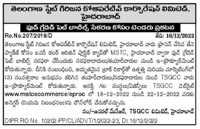 Tender for suppliers/manufacturers for supply of Food Grade PET Bottles with Ivory Color Origin Plastic Cat through MSTC, Hyderabad for package of processed honey.