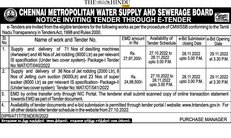 Tender for Supply and delivery of 36 Nos of Jet rodding (2000 Ltr), 8 Nos of Jetting cum suction (9000Ltr) and 23 Nos of super sucker (8000 Ltr) as per relevant IS specification- Package-II (Under two cover system) Tender No: MAT/OT/041/2022