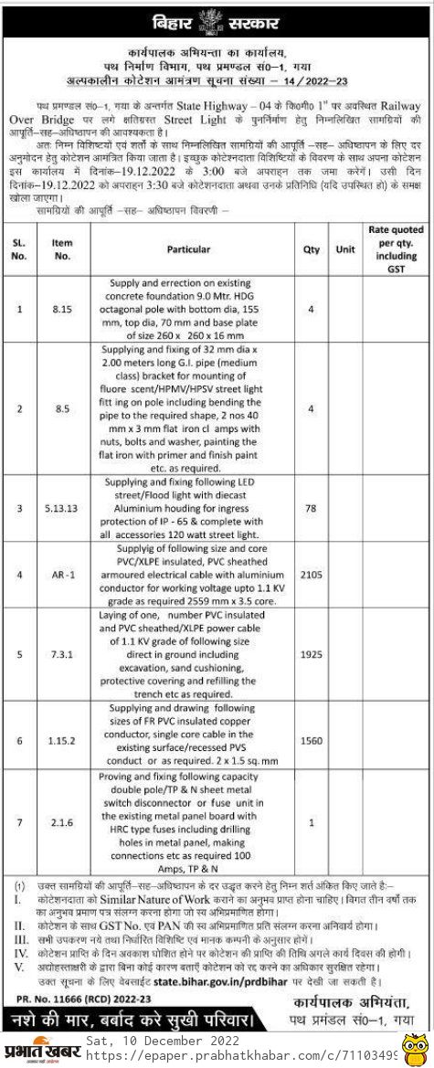 Tender for Supply and errection on existing concrete foundation 9.0 Mtr. HDG 1 8.15 octagonal pole with bottom dia, 155 mm, top dia, 70 mm and base plate of size 260 x 260 x 16 mm