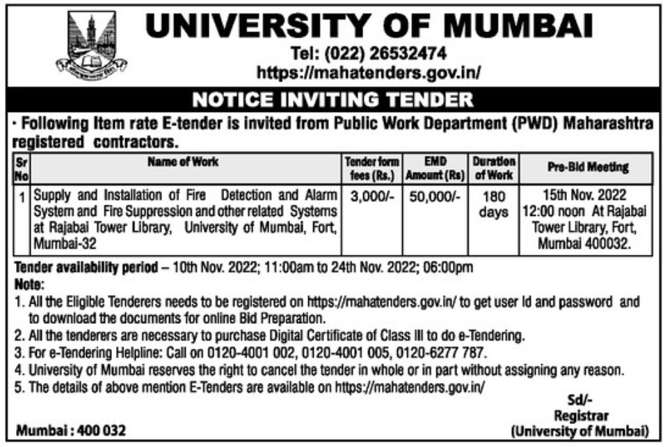 Tender for Supply and Installation of Fire Detection and Alarm System and Fire Suppression and other related Systems at Rajabai Tower Library, University of Mumbai, Fort, Mumbai-32