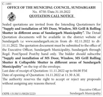 Tender for “Supply and installation of MS Door, Window, MS Grill & Rolling Shutter in different areas of Sundargarh Municipality”.
