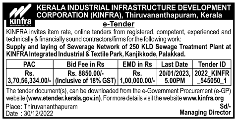 Supply and laying of Sewerage Network of 250 KLD Sewage Treatment Plant at KINFRA Integrated Industrial & Textile Park, Kanjikkode, Palakkad.