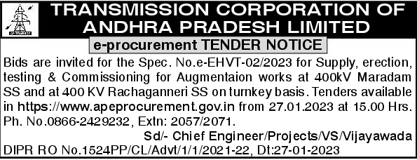 Tender for Supply, erection, testing & Commissioning for Augmentaion works at 400kV Maradam SS and at 400 KV Rachaganneri SS on turnkey basis.