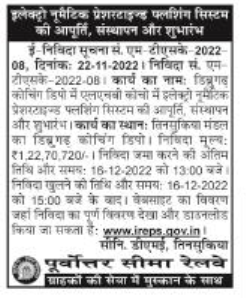 Tender For Supply, Installation and Commissioning of Electro-matic Pressurized Pulsing System at LHB Kochi at Dibrugarh Coaching Depot Location of Work.