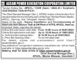 Tender for Supply, Installation and Commissioning of Sulphuric Acid Dilution Tank at DM Plant of NTPS, APGCL, Namrup.