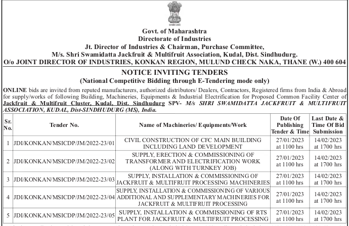 Tender for SUPPLY, INSTALLATION & COMMISSIONING OF VARIOUS ADDITIONAL AND SUPPLEMENTARY MACHINERIES FOR JACKFRUIT & MULTIFRUIT PROCESSING