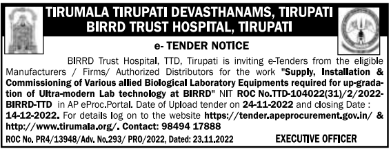“Supply, Installation & Commissioning of Various allied Biological Laboratory Equipments required for up-grada- tion of Ultra-modern Lab technology at BIRRD”