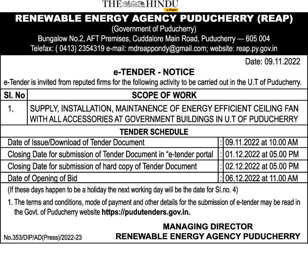 Tender for SUPPLY, INSTALLATION, MAINTANENCE OF ENERGY EFFICIENT CEILING FAN WITH ALL ACCESSORIES AT GOVERNMENT BUILDINGS IN U.T OF PUDUCHERRY