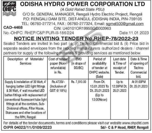 Tender for Supply & installation of 30 Watt, 4′ hanging batten LED light fittings & 36 Watt, 4′ wall mounted LED batten fittings with replacement of conventional fluorescent tube light fittings at all the comidors
