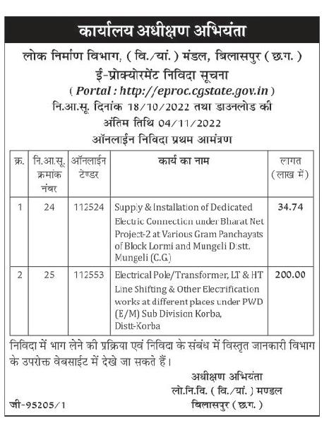 Supply & Installation of Dedicated Electric Connection under Bharat Net Project-2 at Various Gram Panchayats of Block Lormi and Mungeli Distt. Mungeli (C.G)
