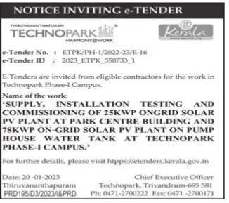Tender for SUPPLY, INSTALLATION TESTING AND COMMISSIONING OF 25KWP ONGRID SOLAR PV PLANT AT PARK CENTRE BUILDING AND 78KWP ON-GRID SOLAR PV PLANT ON PUMP HOUSE WATER TANK AT TECHNOPARK PHASE-I CAMPUS.