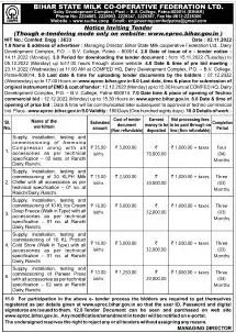Tender for Supply, installation, testing and commissioning of Ammonia Compressor along with all accessories as per technical specification 02 sets. at Ranchi Dairy, Ranchi.
