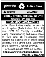 Tender for “Supply, installation, testing, commissioning and maintenance of “Two Lifts (8 Passenger) after dismantling existing lifts at Indian Bank
