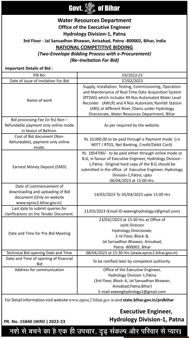 Tender for Supply, Installation, Testing, Commissioning, Operation and Maintenance of Real Time Data Acquisition System (RTDAS) which includes 94 Nos Automated Water Level Recorder (AWLR) and 4 Nos Automatic Rainfall Station (ARS) at different River/Dams under Hydrology Directorate, Water Resources Department, Bihar