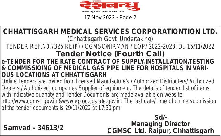 SUPPLY INSTALLATION,TESTING & COMMISSIOING OF MEDICAL GAS PIPE LINE FOR HOSPITALS IN VARIOUS LOCATIONS AT CHHATTISGARH