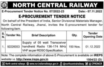 Tender for Supply of 05 watt Transceiver handheld Radio 136-174 MHz VHF as per RDSO Specification.