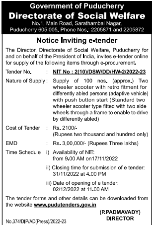 Supply of 100 nos. (approx.) Two wheeler scooter with retro fitment for differently abled persons (adaptive vehicle) with push button start (Standard two wheeler scooter type fitted with two side wheels through a frame to enable to drive by differently abled)