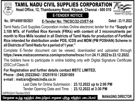 “Supply of 3,100 MTs. of Fortified Rice Kernels (FRKS) with content of 3 micronutrients per month to Rice Mills located in all Districts of Tamil Nadu for production of Fortified Rice intended for distribution under PDS, ICDS and MDM (PM POSHAN) Scheme in all Districts of Tamil Nadu for a period of 1 year.”
