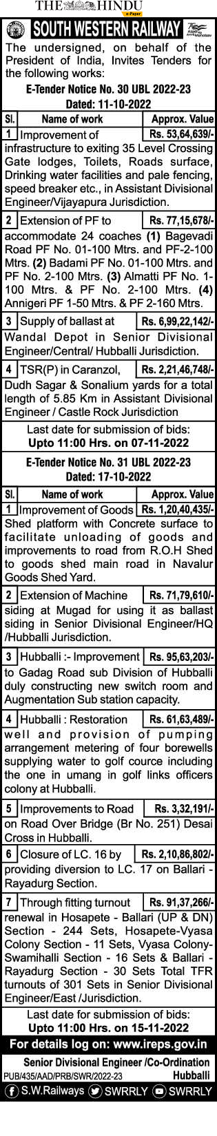 Tender for Supply of ballast at Rs. 6,99,22,142/ Wandal Depot in Senior Divisional Engineer/Central/ Hubballi Jurisdiction.