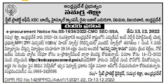 Tender for supply of belts, notebooks and bags under the scheme of “Jagananna Vidya Kanuka” to all students