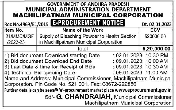 Tender for Supply of Bleaching Powder to Health Section in Machilipatnam Municipal Corporation