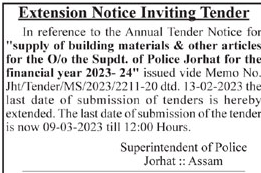 Tender for supply of building materials & other articles for the O/o the Supdt. of Police Jorhat for the financial year 2023-24