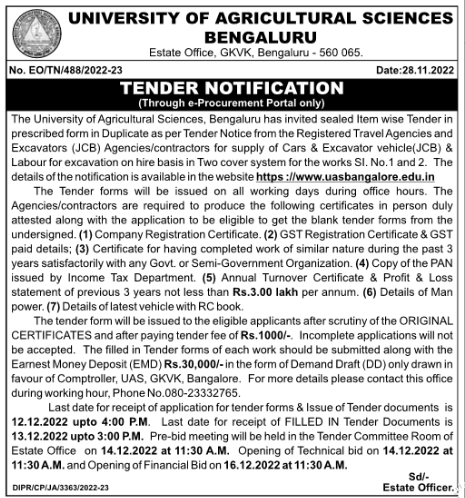 Tender for supply of Cars & Excavator vehicle(JCB) & Labour for excavation on hire basis in Two cover system for the works