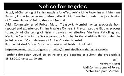 Supply of Chartering of Fishing trawlers for effective Maritime Patrolling and Maritime Security in the Sea adjacent to Mumbai in the Maritime limits under the jurisdication of Commissioner of Police, Greater Mumbai