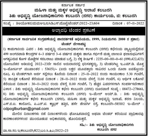 Tender for supply of chicken eggs required by Child Development Project Officers of 499 Anganwadi Centers under the jurisdiction of Kalaburagi (City)