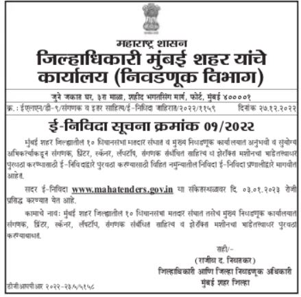 Tender for Supply of computers, printers, scanners, laptops, computer related materials and xerox machines on lease in 10 assembly constituencies of Mumbai city district as well as in the main election