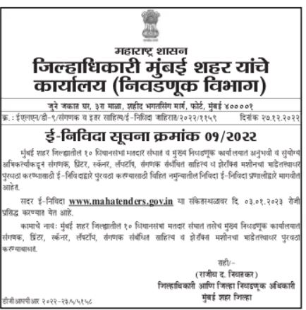 Tender for Supply of computers, printers, scanners, laptops, computer related materials and xerox machines on lease in 10 assembly constituencies of Mumbai city district as well as in the main election