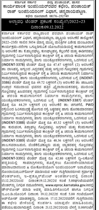 Tender for Supply of Construction Materials and Machinery for Concrete Road & Drainage Works being constructed at Araseikere District: Basavarajpur, Bendekere, Chikkur and Badarahalli Gollarhatti Villages