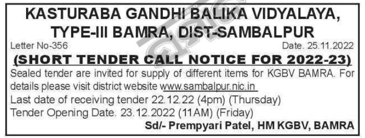 Tender for supply of different items for KGBV BAMRA. For details please visit district