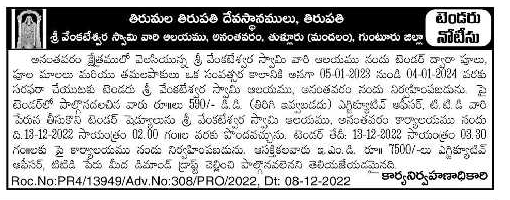 Tender for supply of flowers, flower garlands and betel leaves for one year period i.e. from 05-01-2023 to 01-01-2024 to Sri Venkateswara Swamy temple situated in Anantavaram