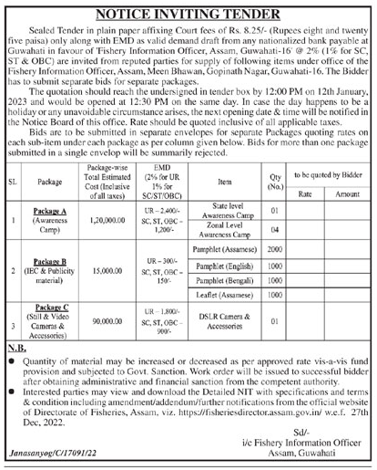 tender for supply of following items under office of the Fishery Information Officer, Assam, Meen Bhawan Awareness Camp