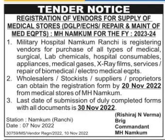 TENDER FOR SUPPLY OF MEDICAL STORES (DGLP/ECHS/ REPAIR & MAINT OF MED EQPTS): MH NAMKUM FOR THE FY: 2023-24.