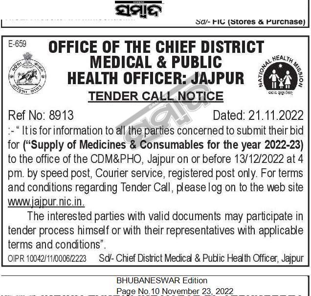 to the office of the CDM&PHO, Jajpur on or before 13/12/2022 at 4