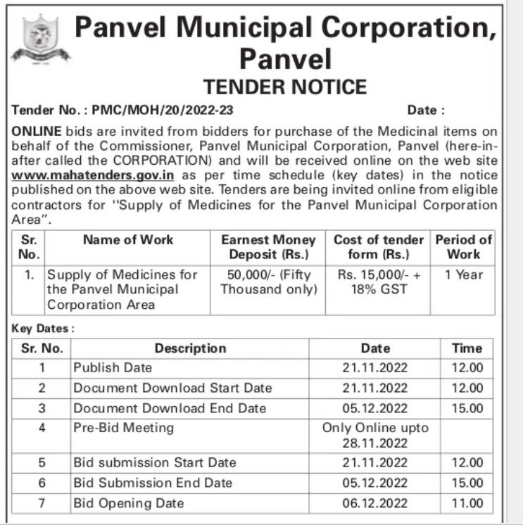 Tender For “Supply of Medicines for the Panvel Municipal Corporation Area”.