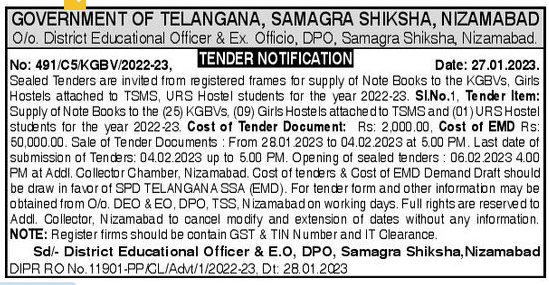 Tender for for supply of Note Books to the KGBVS, Girls Hostels attached to TSMS, URS Hostel students for the year 2022-23. SI.No.1. Tender Item: Supply of Note Books to the (25) KGBVS. (09) Girls Hostels attached to TSMS and (01) URS Hostel students for the year 2022-23.