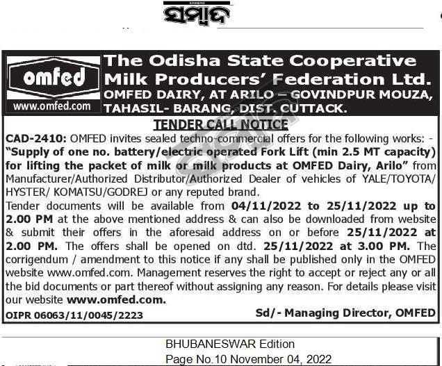 Tender for Supply of one no. battery/electric operated Fork Lift (min 2.5 MT capacity) for lifting the packet of milk or milk products at OMFED Dairy, Arilo