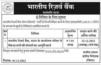 Tender for Supply of packaged water bottles to the office premises of Reserve Bank of India, Patna