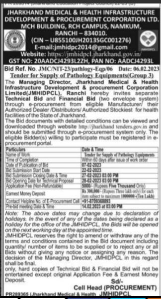 Tender for Supply of Pathology Equipments(Group 3) The Managing Director, Jharkhand Medical & Health