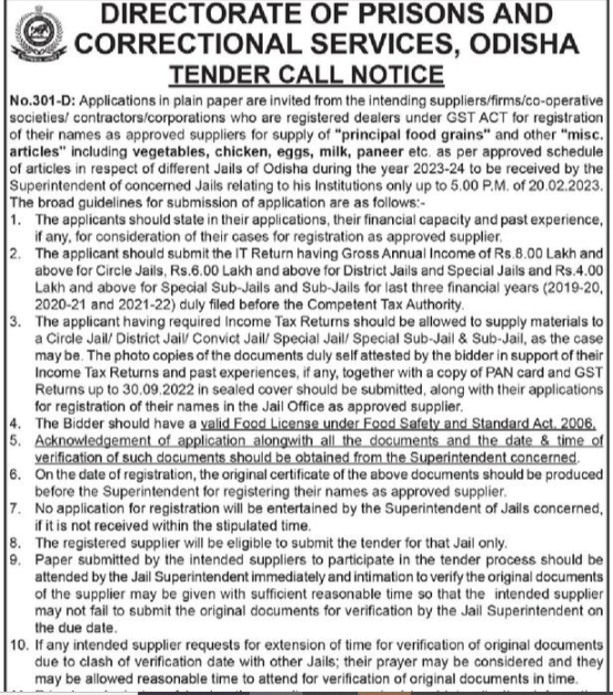 of articles in respect of different Jails of Odisha during the year 2023-24 to be received