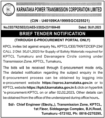 Tender for Supply of Safety Materials required for KPTCL Tumakuru and Davanagere Circle coming under Transmission Zone, KPTCL, Tumakuru.