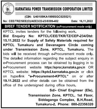 Supply of Safety Materials required for KPTCL Tumakuru and Davanagere Circle coming under Transmission Zone, KPTCL, Tumakuru.
