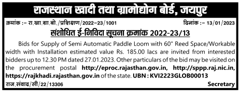 Bids for Supply of Semi Automatic Paddle Loom with 60 Reed Space/Workable width with Installation