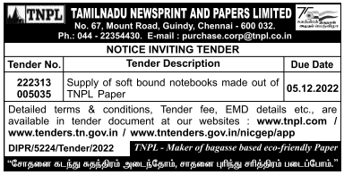 Tender for Supply of soft bound notebooks made out of TNPL Paper
