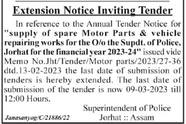 Tender for supply of spare Motor Parts & vehicle repairing works for the O/o the Supdt. of Police, Jorhat for the financial year 2023-24